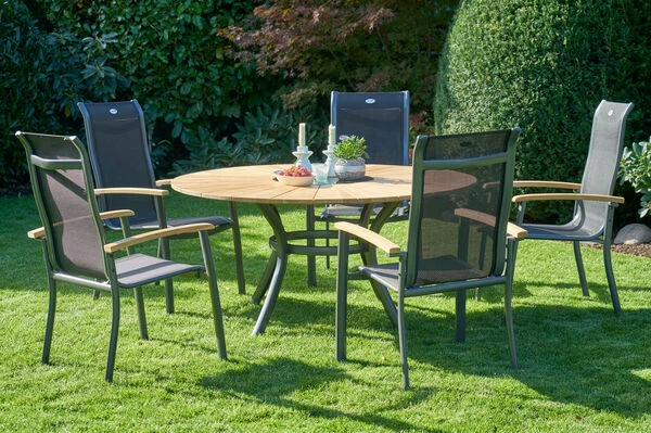 Modern und robust zugleich präsentiert sich diese besondere Esstischgarnitur aus dem Hause Hartman. Das Set besteht aus dem Gartentisch Provence und 5 Stapelsesseln Alice.