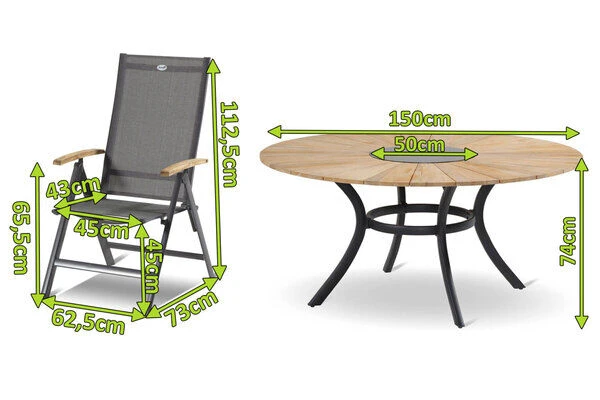 Der Tisch ist gefertigt aus pulverbeschichtetem Aluminium in der Farbe Xerix (Anthrazit) und wird optisch perfekt durch die runde Tischplatte aus SVLK-zertifiziertem Teakholz ergänzt. Die Maße von ca. Ø 150 x 74 cm sorgen dafür, dass stets ausreichend Ablagefläche zur Verfügung steht und Ihre Gäste bequem genügend Platz finden. Das Highlight dieses Tisches ist das Granitinlay, das bei Bedarf problemlos herausgenommen und durch den im Lieferumfang enthaltenen Eiskühler ausgetauscht werden kann. So haben Sie auch bei sommerlichen Temperaturen stets gekühlte Getränke direkt zur Hand. Mit den Multipositionssesseln aus der Aruba Serie kommt die perfekte Kombination aus Stil und Komfort in den heimischen Garten – denn das Modell besticht nicht nur durch den robusten Aluminiumrahmen und die hochwertigen Armlehnen aus FSC®-Teakholz, sondern auch durch die justierbare Rückenlehne, die aufrecht wie zurückgelehnt herausragenden Komfort bietet. Mit Maßen von ca. 73 x 62,5 x 112,5 cm, einer Sitzhöhe von ca. 45 cm und einer Sitzfläche von ca. 45 x 43 cm passt er perfekt zum Tisch. Die Sessel sind in einem edlen xerix / anthrazit gehalten, lediglich die Armlehnen aus FSC®-zertifiziertem Teak sind farblich hervorgehoben. Die verwendeten Materialien sind extrem witterungsbeständig und pflegeleicht, daher können die Möbel auch bei schlechtem Wetter ohne Probleme auf Ihrer Terrasse stehen bleiben. Teakholz hat aufgrund des hohen Anteils an holzeigenen Ölen einen natürlichen Schutz gegen Pilze und Schädlinge. So beschränkt sich die Pflege Ihrer neuen Möbel auf ein Minimum und Sie können Ihre Zeit im Garten mit angenehmen Tätigkeiten verbringen. Die 4×4 Textilenbespannung (70% Polyvinylchlorid, 30% Polyester) der Sessel ist beständig gegen UV-Strahlung, sodass die Farben lange frisch aussehen. Außerdem trocknet sie nach einem kurzen Schauer sehr schnell. Falls die Sessel aber doch mal weggeräumt werden sollen, können sie schnell und einfach zusammengeklappt und platzsparend verstaut werden. Zum Schutz Ihrer Terrasse sind die Sessel und der Tisch mit Fußkappen ausgestattet, welche unschöne Kratzer auf dem Boden vermeiden. Die FSC® bzw. SVLK-Zertifizierung der Möbel garantiert Ihnen, dass das Holz aus verantwortungsvollen Quellen stammt, sodass Sie sich entspannt zurücklehnen und Ihren neuen Gartenstuhl so richtig genießen können.