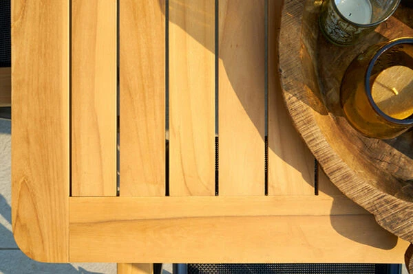 Die Tischleisten aus FSC-zertifiziertem Teakholz verleihen diesem Tisch einen ganz besonderen Charme. Darüber hinaus ist Teakholz besonders witterungsbeständig und hält sowohl Hitze und Frost, als auch Regen und Feuchtigkeit aus. Es hat außerdem aufgrund des hohen Anteils an holzeigenen Ölen einen natürlichen Schutz gegen Pilze und andere Schädlinge.