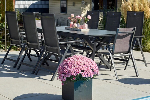 Hartman Esstischgarnitur mit Xanadu Ausziehtisch aus Alu, 2 Stapelsessel und 6 Multipositionssessel aus der Serie „Aruba“