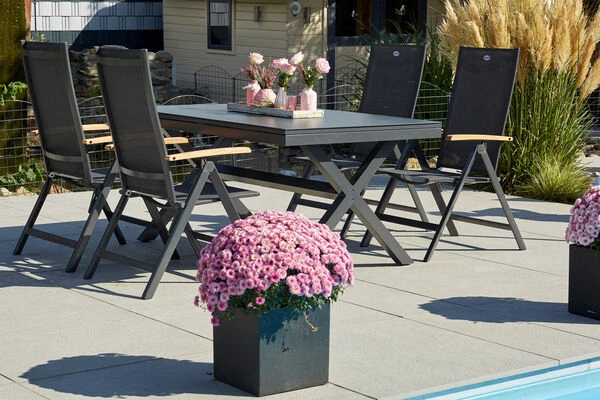 Hartman Esstischgarnitur mit Xanadu Ausziehtisch aus Alu und 4 Multipositionssessel aus der Serie „Aruba“
