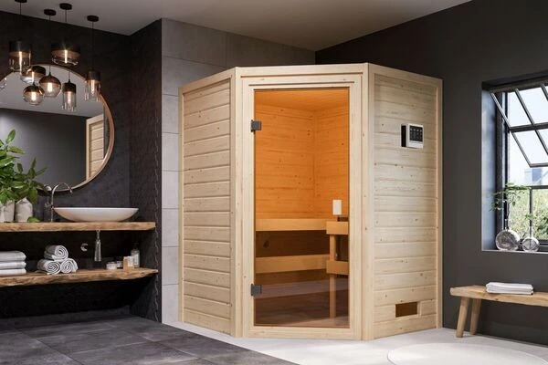 Sauna Antonia aus Fichtenholz mit Eckeinstieg in verschiedenen Ausführungen von KARIBU