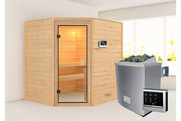 1x KARIBU 38 mm Sauna Elea mit Eckeinstieg und bronzierter Tür in verschiedenen Ausführungen inkl. Montageanleitung und -material