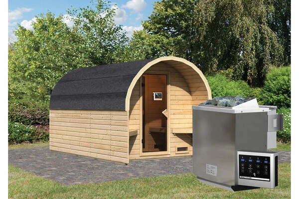 1x KARIBU Fasshaus 3 Saunahaus, naturbelassen, Fichte, ca. 219 x 385 x 218,5 cm, Fronteinstieg, SET mit Ofen 9 kW Bio ext. Strg.