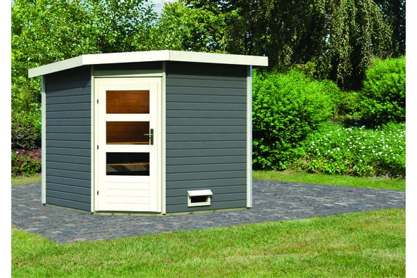 Saunahaus Heikki terragrau aus Fichtenholz mit Eckeinstieg in verschiedenen Ausführungen von KARIBU