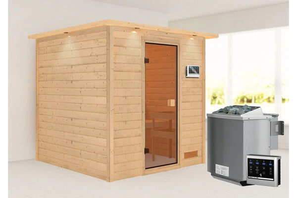 1x KARIBU 38 mm Sauna Jara mit Fronteinstieg, inkl. Dachkranz und bronzierter Tür in verschiedenen Ausführungen inkl. Montageanleitung und -material