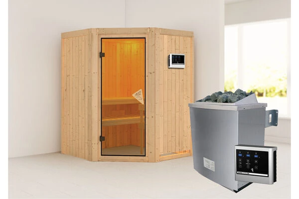 1x KARIBU Larin Sauna, naturbelassen, Fichte, ca. 151 x 151 x 198 cm, Eckeinstieg, mit bronzierter Tür, SET mit Ofen 4,5 kW ext. Strg. Easy