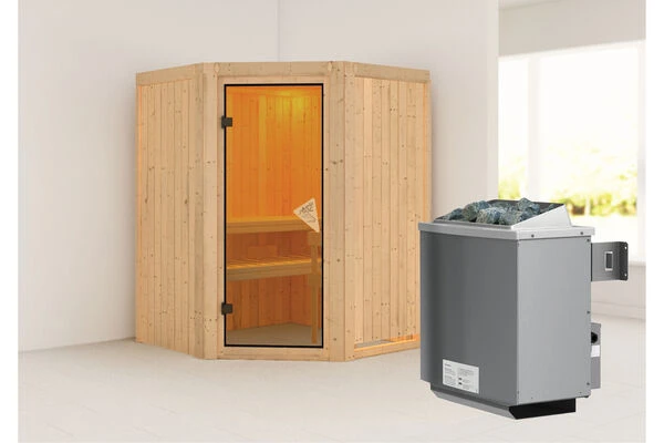1x KARIBU 68 mm System Sauna Larin mit Eckeinstieg und bronzierter Tür in verschiedenen Ausführungen inkl. Montageanleitung und -material