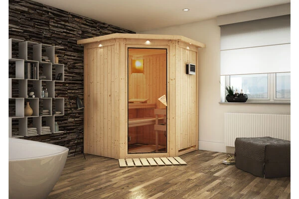 Sauna Larin aus Fichtenholz mit Eckeinstieg inkl. bronzierter Tür in verschiedenen Ausführungen von KARIBU