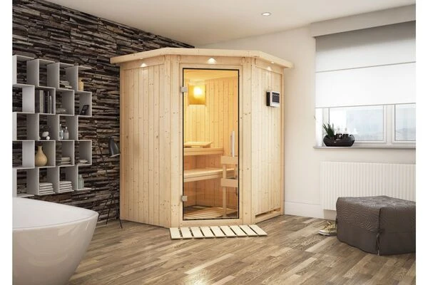 Sauna Larin aus Fichtenholz mit Eckeinstieg inkl. Klarglastür in verschiedenen Ausführungen von KARIBU