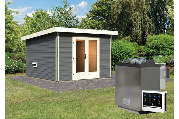1 x KARIBU Mainburg 1 Saunahaus, terragrau, Fichte, 309x309x229 cm, SET 1 mit Doppelflügeltür, Vorraum und 9 kW Bio-Ofen