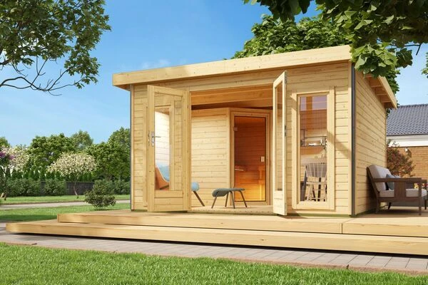 1x KARIBU 38 mm Saunahaus Mainburg 3 SET A mit Doppelflügeltür und Vorraum, in verschiedenen Ausführungen inkl. Montageanleitung und -material