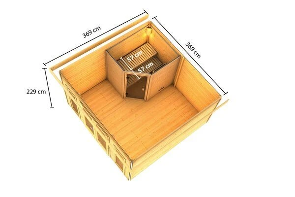 1 x KARIBU Mainburg 3 Saunahaus, naturbelassen, Fichte, 369x369x229 cm, SET A mit Doppelflügeltür und Vorraum