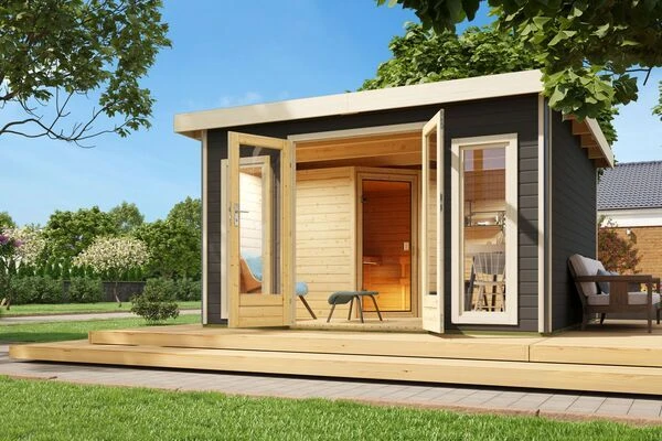 Saunahaus Mainburg 3 SET A aus Fichtenholz mit Doppelflügeltür und Vorraum in verschiedenen Farben und Ausführungen von KARIBU