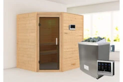 1x KARIBU 38 mm Sauna Mia mit Eckeinstieg und graphitfarbener Tür in verschiedenen Ausführungen inkl. Montageanleitung und -material