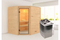 1x KARIBU 38 mm Sauna Mia mit Eckeinstieg und Klarglastür in verschiedenen Ausführungen inkl. Montageanleitung und -material