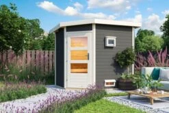 Saunahaus Mikka terragrau aus Fichtenholz mit Eckeinstieg in verschiedenen Ausführungen von KARIBU