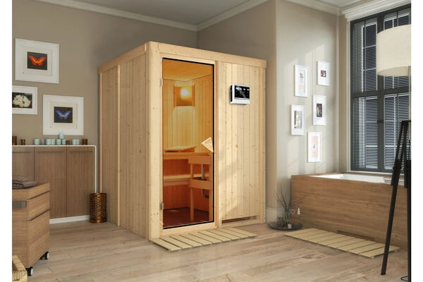 1x KARIBU 68 mm System Sauna Norin mit Fronteinstieg, bronzierter Tür in verschiedenen Ausführungen inkl. Montageanleitung und -material