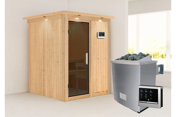 Sauna Norin aus Fichtenholz mit Fronteinstieg inkl. graphitfarbener Tür in verschiedenen Ausführungen von KARIBU