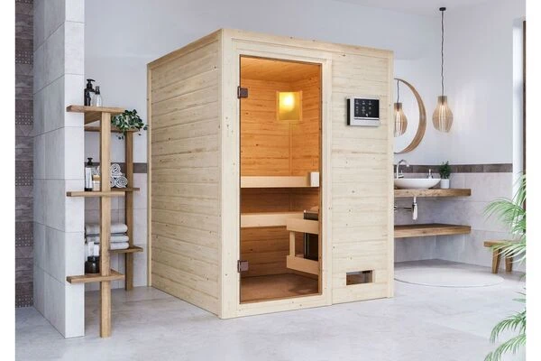 1x KARIBU 38 mm Sauna Sandra mit Fronteinstieg und bronzierter Tür in verschiedenen Ausführungen inkl. Montageanleitung und -material