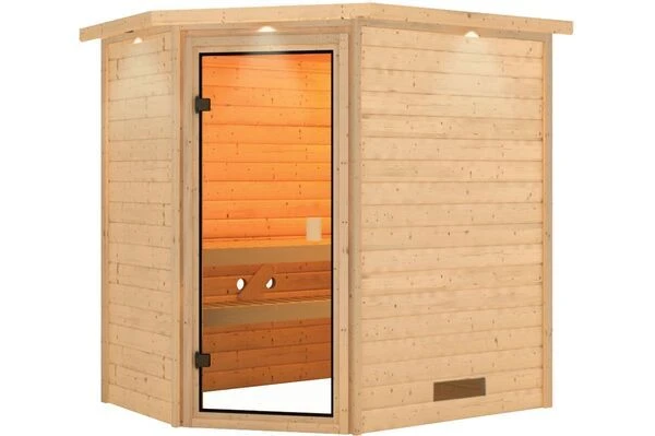 Eckeinstieg-Massivholzsauna inklusive zwei Liegen und Ofenschutzgitter