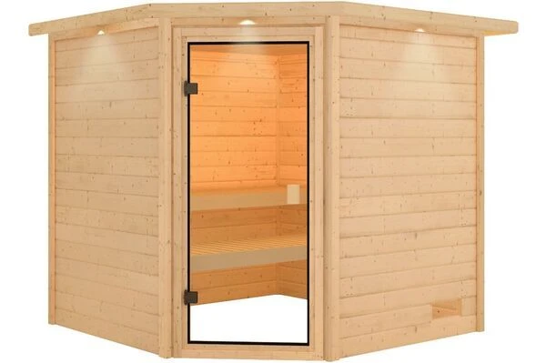 Eckeinstieg-Massivholzsauna inklusive zwei Liegen und Ofenschutzgitter