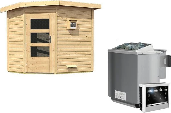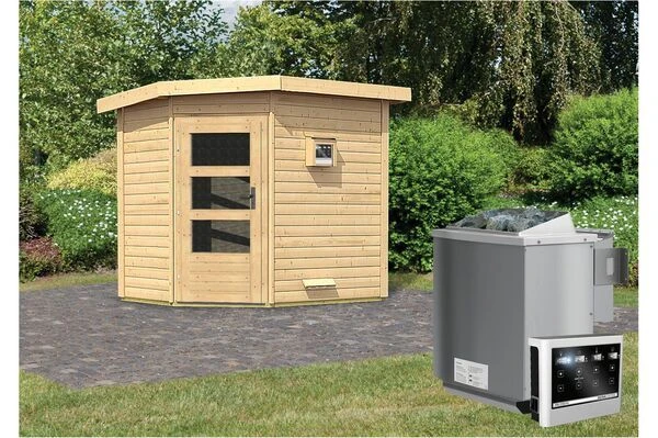 Ecksaunahaus Mikka mit Eckeinstieg von KARIBU mit diversen Tür-, Ofen- und Steuerungsoptionen
