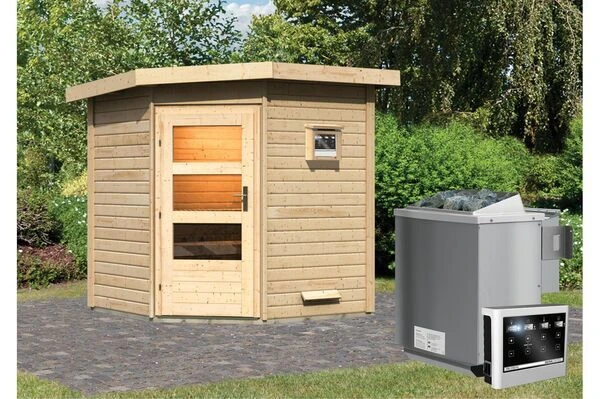 Ecksaunahaus Pekka mit Eckeinstieg von KARIBU mit diversen Tür-, Ofen- und Steuerungsoptionen