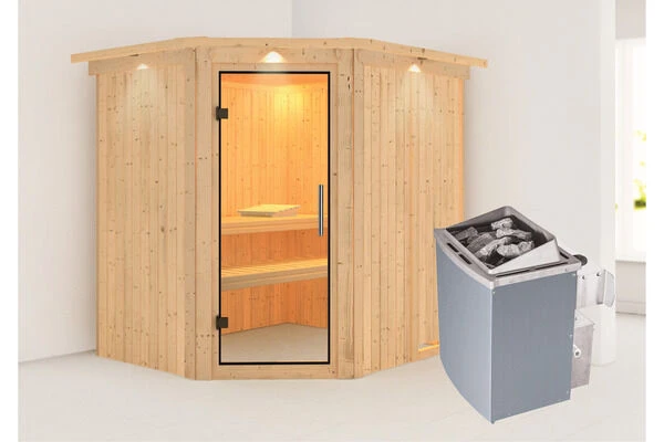 1x KARIBU 68 mm System Sauna Siirin mit Eckeinstieg, transparenter Ganzglastür und Dachkranz in verschiedenen Ausführungen inkl. Montageanleitung und -material