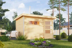 Das Saunahaus Skrollan 2 aus nordischer Fichte von KARIBU wird aus 38 mm Wandbrettern im Steck-/Schraubsystem gefertigt und kann somit rasch und einfach aufgebaut werden. Das praktische Pultdach aus Massivholz sorgt dafür, dass das Saunahaus schnell und wirkungsvoll gegen Witterungseinflüsse geschützt ist. Mit ihren Außenmaßen von ca. 336 x 231 x 227 cm und den Innenmaßen von ca. 324 x 219 x 203 cm, einer Grundfläche von 7 m² und einem umbauten Raum von 16,7 m³ bietet diese Sauna für alle Anforderungen ausreichend Platz. Auch der geräumige Vorraum lädt zum geschützten Verweilen und Entspannen zwischen den Saunagängen ein.