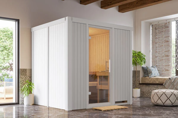 Sauna Sodin aus Fichtenholz mit Fronteinstieg und einer Klarglastür, lichtgrau in verschiedenen Ausführungen von KARIBU