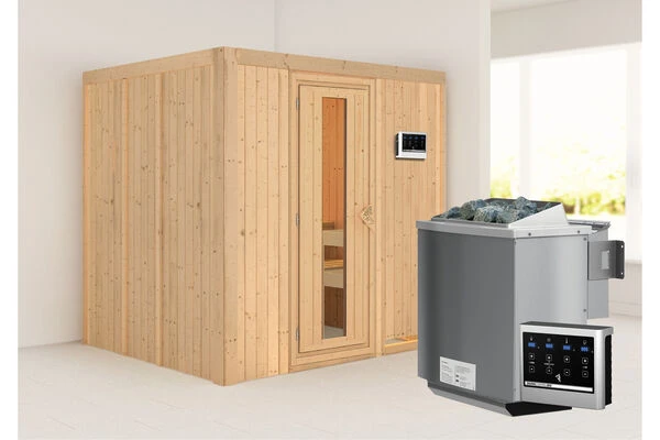 1x KARIBU Sodin Sauna inkl. Energiespartür, Ofen 4,5 kW Bio ext. Strg.