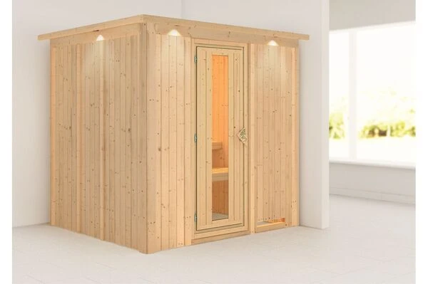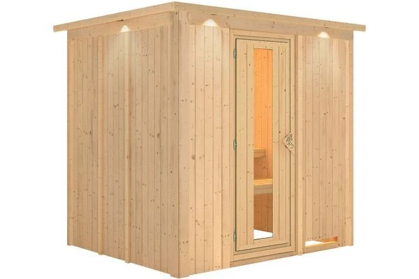 KARIBU Sauna Daria mit Fronteinstieg und diversen Tür-, Ofen-, Steuerung- und Kranzoptionen