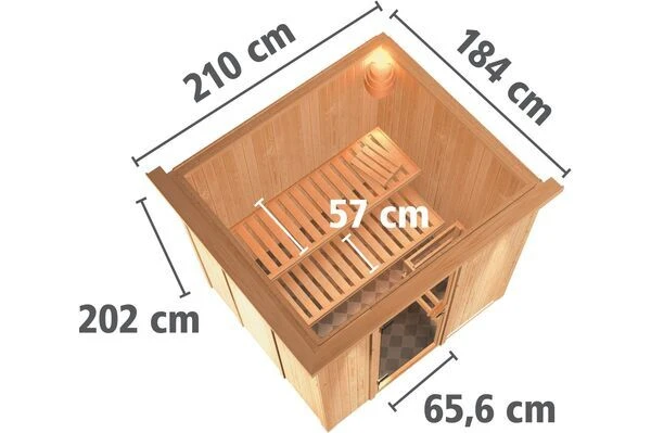 Außen befindet sich dann eine stabile Hartfaserplatte. Die Sauna verfügt über einen formschönen und praktischen Fronteinstieg. Mit ihren Außenmaßen von ca. 196 x 170 x 198 cm (mit Kranz ca. 210 x 184 x 202 cm) und den daraus resultierenden Innenmaßen von ca. 181 x 155 x 192 cm bietet diese Sauna für alle Anforderungen ausreichend Platz. Die zwei Liegen werden innen auf Vierkanthölzern montiert, welche aufgrund der Systembauweise in der Höhe nicht flexibel sind. Die untere Liege kann jedoch bei Bedarf platzsparend unter die obere Bank geschoben werden, sodass der Innenraum größer wirkt und sich die Reinigung einfacher gestaltet. Ein Ofenschutzgitter ist stets im Lieferumfang enthalten, ebenso wie zwei Bänke und eine Kopfstütze, die das Interieur gekonnt abrunden.