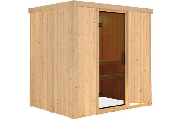 | System-Bauweise Die günstigere Alternative zur Massivholzsauna. Die Wände sind mehrschichtig aufgebaut und im Kern mit Mineralwolle gedämmt. Die Innen- und Sichtseiten sind mit Profilholz abgeschlagen, während die nicht sichtbaren Seiten außen mit Hartfaserplatten verkleidet sind. Bei dieser Bauart kann ein angenehmes Saunaklima entstehen und der Energieverbrauch ist vergleichsweise niedrig.   | |