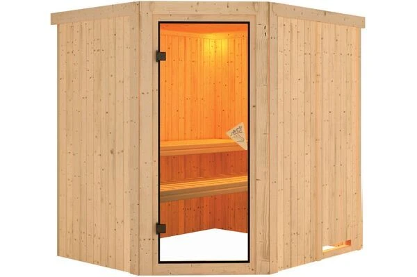 KARIBU Ecksauna Lilja mit Eckeinstieg und diversen Tür-, Ofen-, Steuerung- und Kranzoptionen