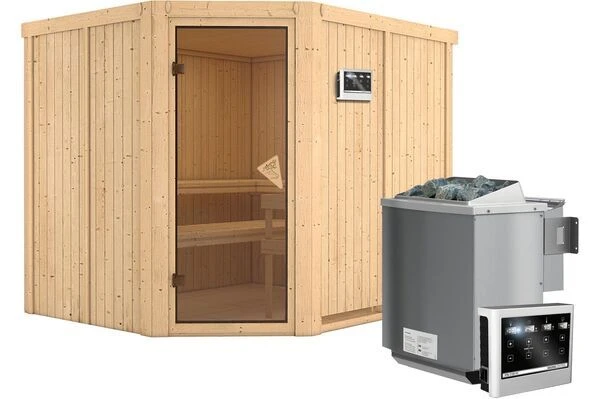 KARIBU Ecksauna Malin mit Eckeinstieg und diversen Tür-, Ofen-, Steuerung- und Kranzoptionen