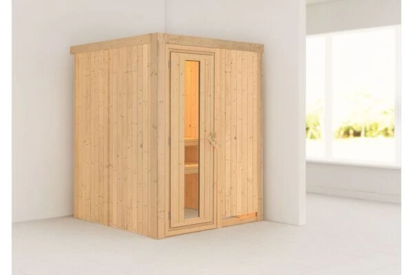 KARIBU Sauna Minja mit Fronteinstieg und diversen Tür-, Ofen-, Steuerung- und Kranzoptionen