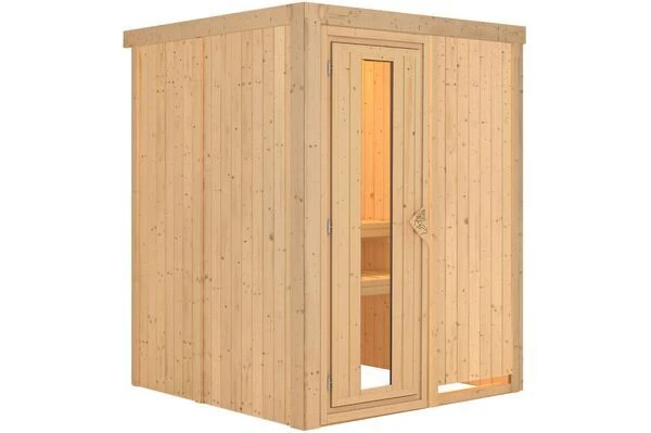 | System-Bauweise Die günstigere Alternative zur Massivholzsauna. Die Wände sind mehrschichtig aufgebaut und im Kern mit Mineralwolle gedämmt. Die Innen- und Sichtseiten sind mit Profilholz abgeschlagen, während die nicht sichtbaren Seiten außen mit Hartfaserplatten verkleidet sind. Bei dieser Bauart kann ein angenehmes Saunaklima entstehen und der Energieverbrauch ist vergleichsweise niedrig.   | |