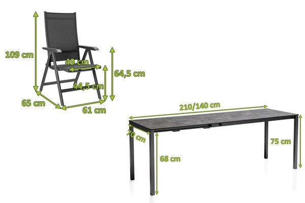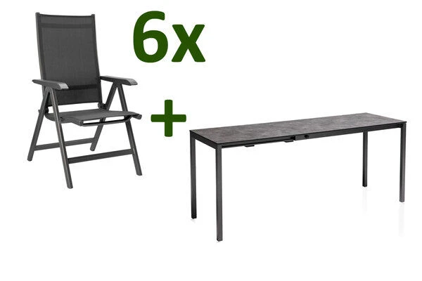 Bei dieser Esstischgruppe treffen hochwertige Materialien und Design auf modernste Weise aufeinander. Das Set besteht aus einem innovativen Ausziehtisch mit den Maßen von ca. 140/210×70 cm und 6 Multipositionssesseln der Marke Kettler aus der Serie „Basic Plus“.