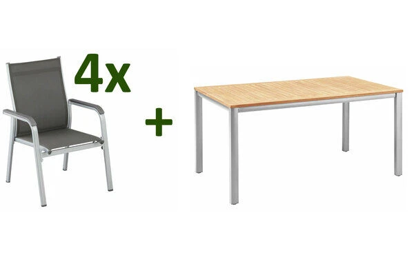 KETTLER Granada/Basic Plus Esstischgruppe, silber/anthrazit, Alu/Teak/Textilene, ca. Esstisch 160×95 cm, 4 Stapelsessel