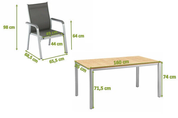 Der rechteckige Tisch für 4-6 Personen bietet Platz für die ganze Familie. Die Tischplatte besteht aus hochwertig verarbeiteten und FSC-zertifizierten Teakholz und wird von einem soliden Gestell aus silberfarbenem Aluminium getragen. Die positiven Eigenschaften von Aluminium sind zahlreich: Es ist leicht, wetterfest, stabil und elegant. In Kombination mit der Stabilität und der natürlichen Patina von Teakholz wird aus diesem Möbelstück das Highlight für Ihren Garten.