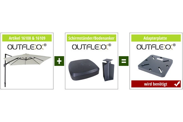 - Kombination mit OUTFLEXX® Schirmständern oder OUTFLEXX® Bodenanker nur mit Adapterplatte 18885 möglich