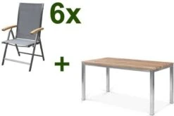 Wenn Sie sich jetzt angesprochen fühlen, sollten Sie sich diese Esstischgarnitur noch genauer anschauen. Das Set besteht aus einem Esstisch mit den Maßen von ca. 150 x 80 x 76 cm und 6 Multipositionssesseln aus einer Teak/Edelstahl Kombination mit einer Textilenbespannung in der Farbe Silber.