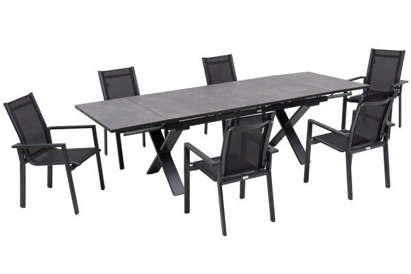 7-teilige Esstischgarnitur von OUTFLEXX® mit Ausziehtisch 180/280x100cm und 6 Stapelsesseln aus Aluminium/HPL/Textilene in schwarz