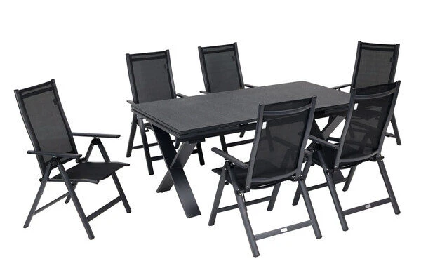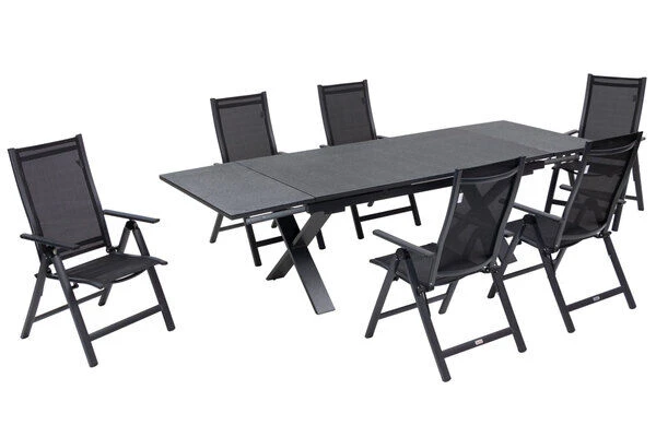 7-teilige Esstischgarnitur von OUTFLEXX® mit Ausziehtisch 180/280x100cm und 6 Multipositionssesseln aus Aluminium/Textilene in schwarz