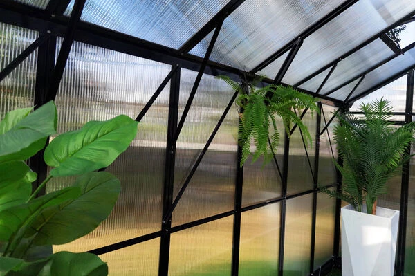 Der pulverbeschichtete Aluminiumrahmen und die ca. 8 mm dicken Hohlkammerplatten aus Polycarbonat sind extrem witterungsbeständig, stabil und robust. Für zusätzliche Stabilität und sicheren Halt sorgen die starken Kantenprofile. Die Polycarbonat-Platten bieten eine hohe Wärmedämmung, eine gute Lichtdurchlässigkeit und gleichzeitig einen ausreichenden UV-Schutz für Ihre Pflanzen, sodass kein zusätzliches Abschattieren mehr nötig ist. Passendes Montagematerial und eine anschauliche Montageanleitung sorgen für einen schnellen und einfachen Aufbau.
