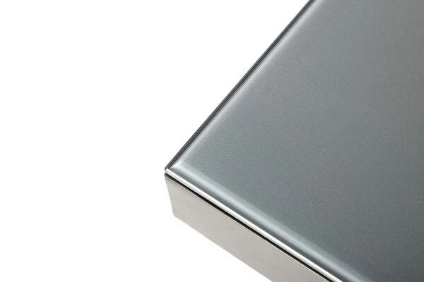 Seine besondere Optik verdankt der Tisch der Kombination aus der ca. 5 cm dicken Tischplatte aus Alu/Einscheibensicherheitsglas und dem matten anthrazitfarbenen Aluminiumgestell. Das ca. 5 mm dicke Sicherheitsglas überzeugt durch seine zahlreichen Vorteile wie eine stark erhöhte Schlag- und Biegefestigkeit und eine hohe Temperaturwechselbeständigkeit -so können warme Speisen auch direkt auf der Tischplatte abgestellt werden. Sollte es einmal zu einem Bruch kommen, splittert das Glas nicht, sondern zerfällt in eine Vielzahl stumpfkantiger, kleiner Scherben mit wesentlich verminderter Verletzungsgefahr. Die besondere Optik verdankt die Tischplatte ihrer geriffelte Oberfläche. Diese sorgt dafür, dass das einfallende Licht nicht reflektiert wird und so ein matter Effekt entsteht. Der graue Siebdruck auf der Unterseite der Glasplatte sorgt für die graue Optik der Tischplatte.