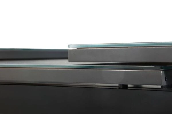 | Sicherheitsglas Das für die Tischplatte verwendete Sicherheitsglas verfügt über eine stark erhöhte Schlag- und Biegefestigkeit und eine hohe Temperaturwechselbeständigkeit, sodass warme Speisen auch direkt auf der Tischplatte abgestellt werden können. Sollte es einmal zu einem Bruch kommen, splittert das Glas nicht, sondern zerfällt in eine Vielzahl stumpfkantiger, kleiner Scherben mit wesentlich verminderter Verletzungsgefahr. | |