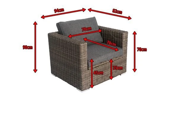 Der Polyrattan Sessel hat ein Stellmaß von ca. 94 x 82 x 70 cm. Mit seinem geringen Gewicht lässt sich das Modul leicht verstellen und verrücken, so dass Sie Ihre neue Wohlfühloase jederzeit neu anordnen können. Der Sessel ist jeweils mit bis zu ca. 150 kg belastbar.